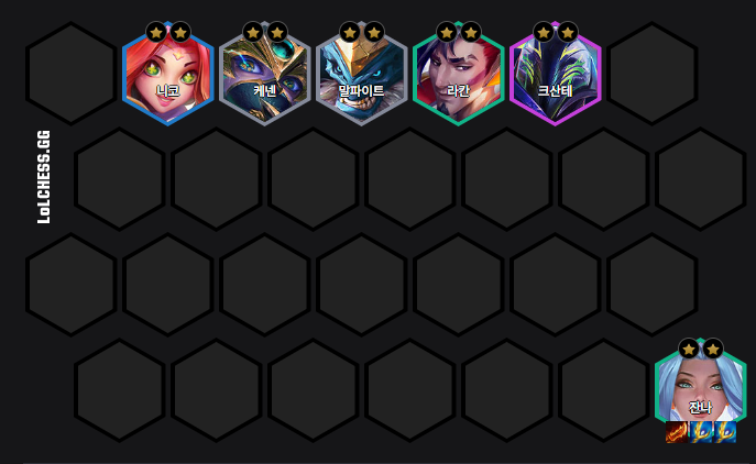 - 전략적 목표: 잔나와 라칸 3성작을 완성하는 가장 중요한 구간입니다. 3-2 라운드에 6레벨을 찍고, 50원 이자를 유지하면서 바닥 리롤을 칩니다.